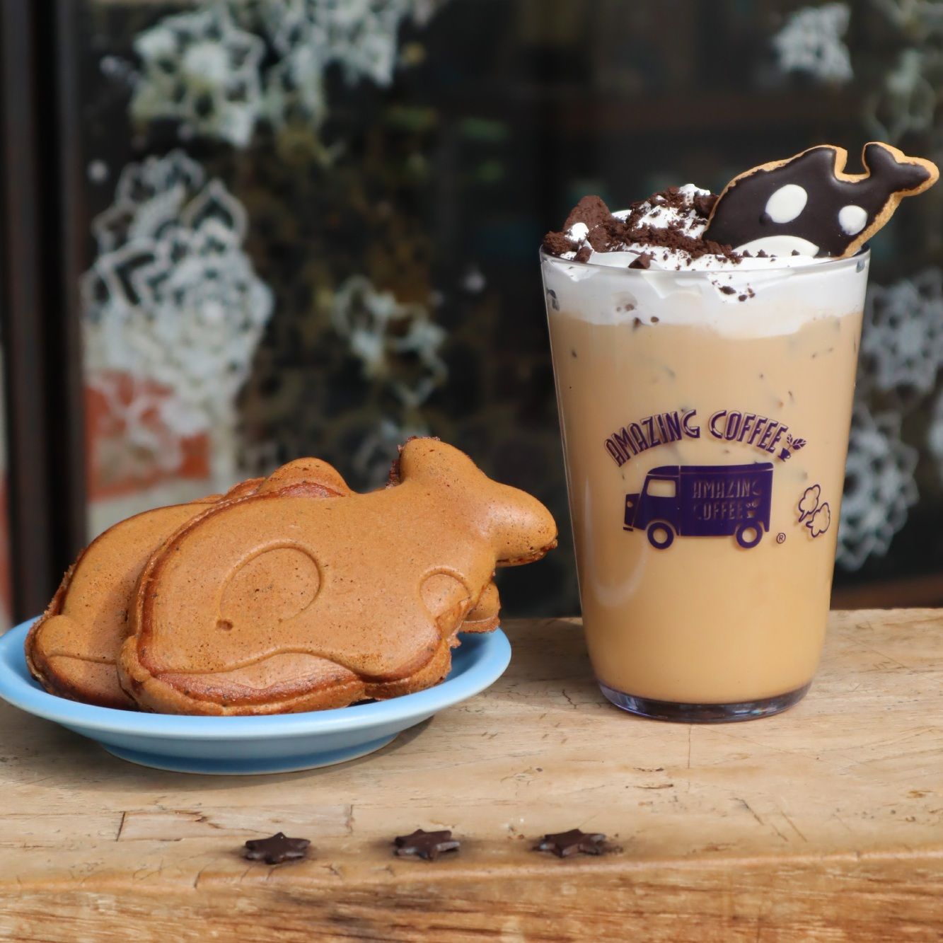 「カフェチョコ」は、シャチクッキーをトッピングした写真映え抜群の一品。「オルカ焼き」は、AMAZING BLENDを生地&クリームにたっぷり使った大判焼きスタイルで、コーヒーとの相性も◎。
