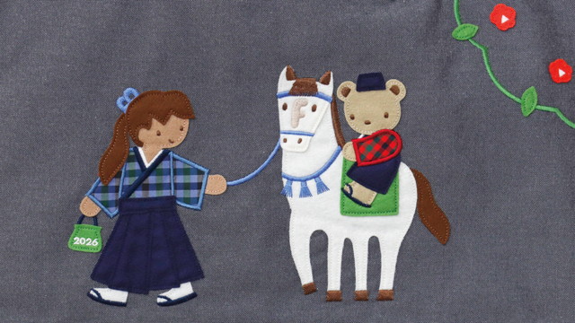 「デニムバッグ」と「ポーチ」は、日本の伝統的な武術”やぶさめ”からインスピレーションを受けたアートで演出。馬具を身に着けた馬に乗るクマちゃんと手綱を持った女の子が和装で表現されています。さらに、女の子とクマちゃんの服にファミリアオリジナルチェック柄を使用しているのもこだわりのポイントです。