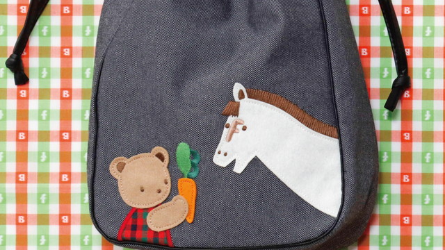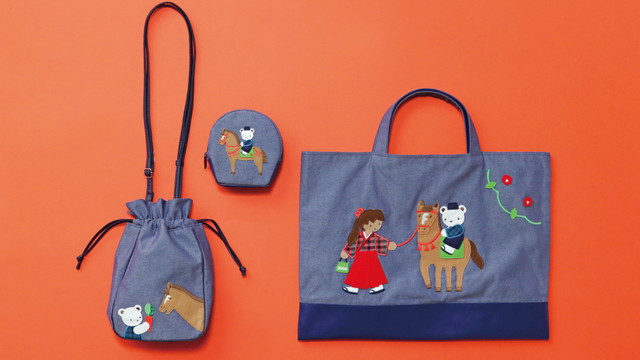 「ショルダーバッグ」には、馬具を外した馬がおやつタイムを楽しむワンシーンが描かれています。クマちゃんも和装から着替えてにんじんをあげている、楽しそうな様子がすてきですね!