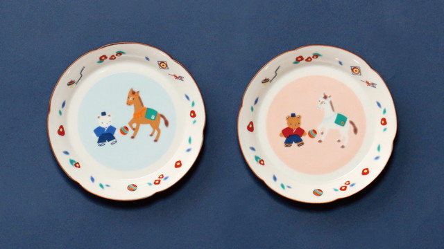 「小皿セット」には、馬とクマちゃんが楽しそうにまりであそんでいるモチーフと、ふちには的や矢、コマなどお正月らしいモチーフがあしらわれています。色違いの2枚セットなので、それぞれ違った表情を楽しんで。