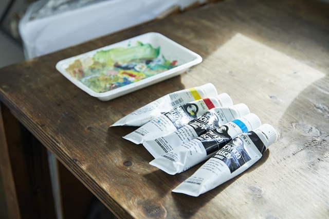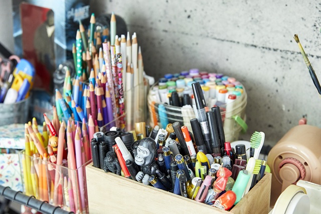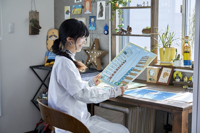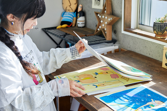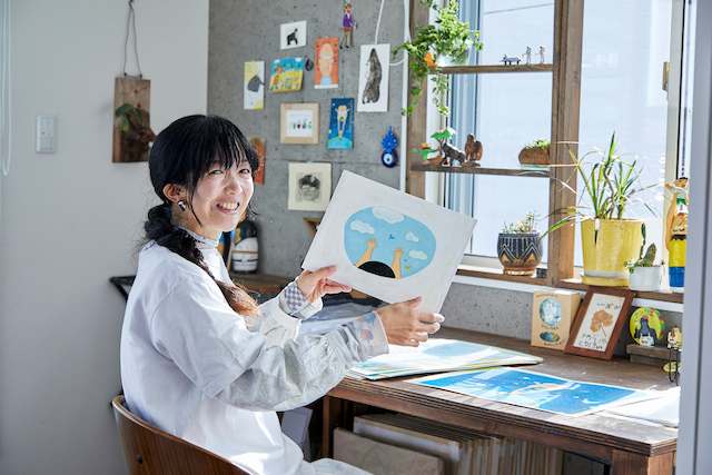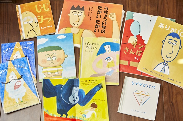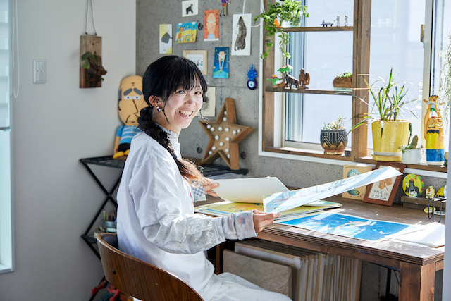 カラフルなアクリル絵具やペンがデスクに並び、窓から穏やかな光が差し込む尼崎市のアトリエで出迎えてくれたのは、絵本作家のホッシーナッキーさん。