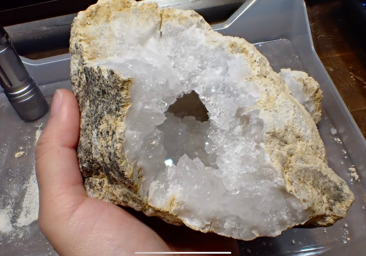 岩の中に眠る結晶をハンマーで割って見る体験コーナー -