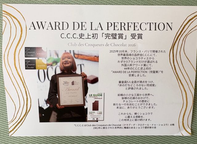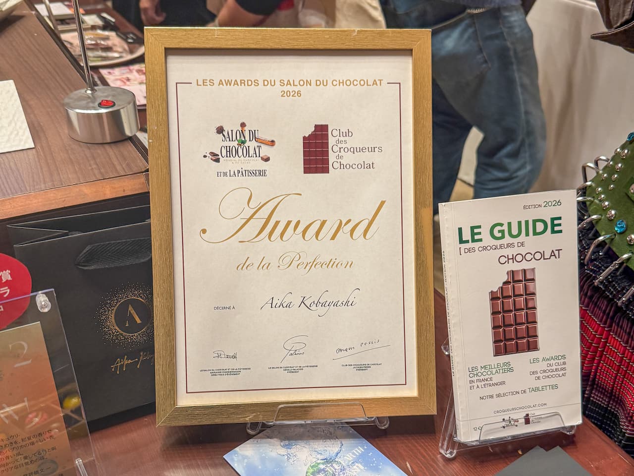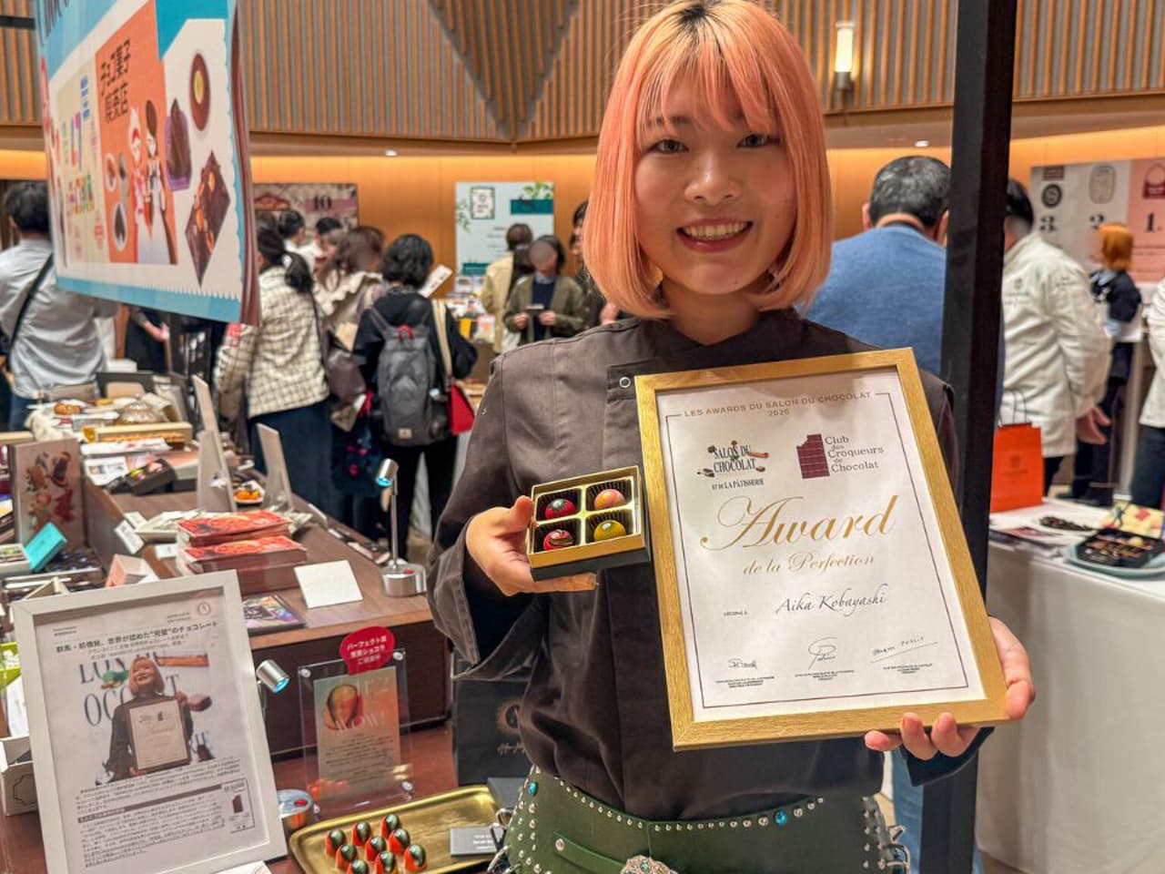 日本各地の素材を生かしたショコラが並ぶ「47チョコ列島」。なかでも注目を集めていたのが、2025年10月にパリで開催された世界最高峰の品評会C.C.C.で外国人枠アワード賞「完璧賞」を受賞した「アイカコバヤシ」です。