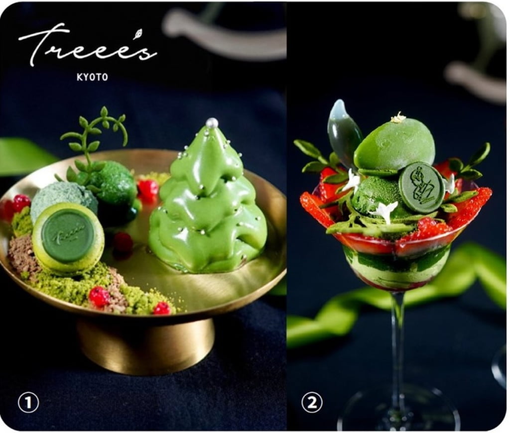 左から、京都・太秦「TREEE’S KYOTO」の「『松澤園』の狭山抹茶と森のベリーのアンサンブル」(1人前/3,300円、阪神梅田本店限定)※12月17日(水)~12月19日(金)・22日(月)限定、「『辻喜』抹茶といちごを使用した2日間限定のプレミアムパフェ(ペアリングスパークリングティ付き)」(1人前/3,850円、阪神梅田本店限定)※12月20日(土)・21日(日)限定 -