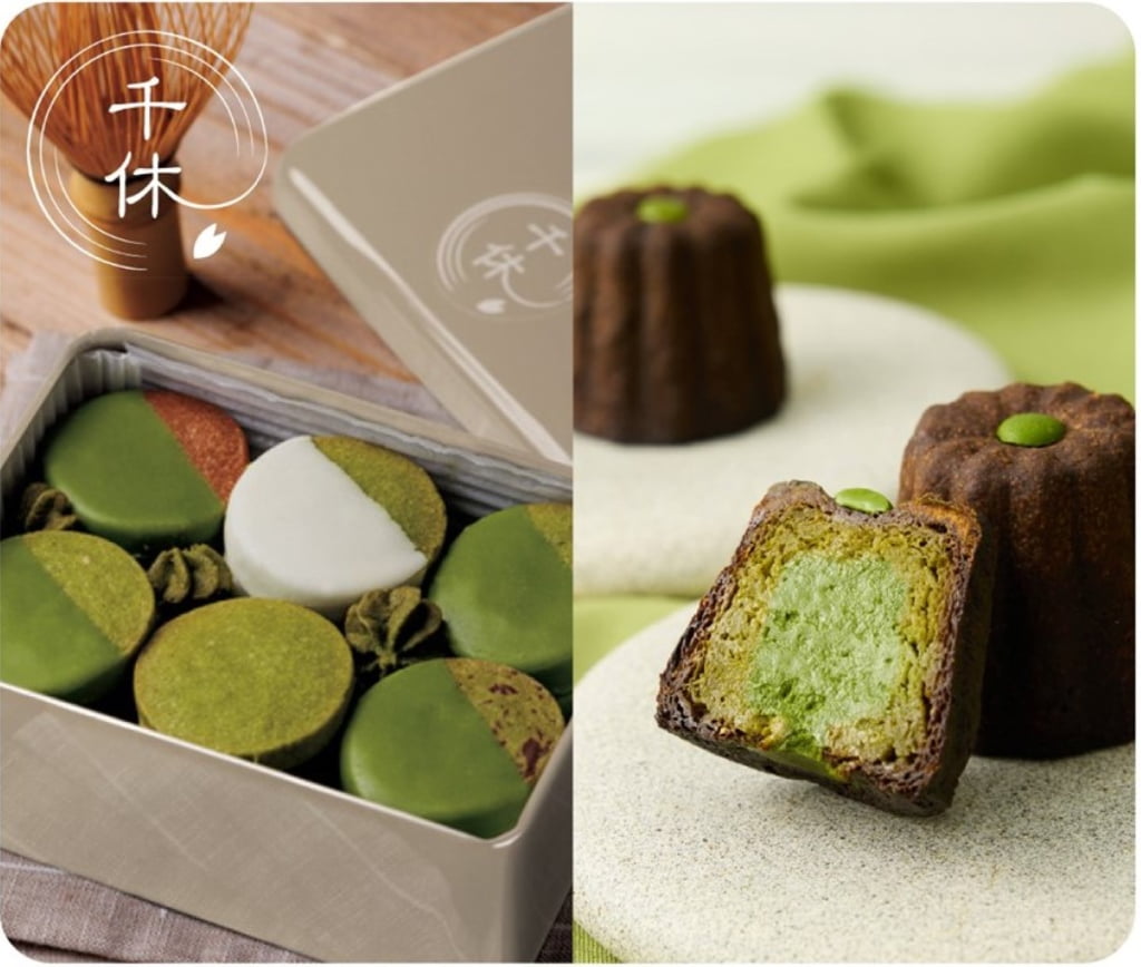 左から、東京・銀座「千休」の「抹茶チョコレートクッキー缶」(24枚入り/3,981円)、「抹茶玄米カヌレ」(1個/591円) -