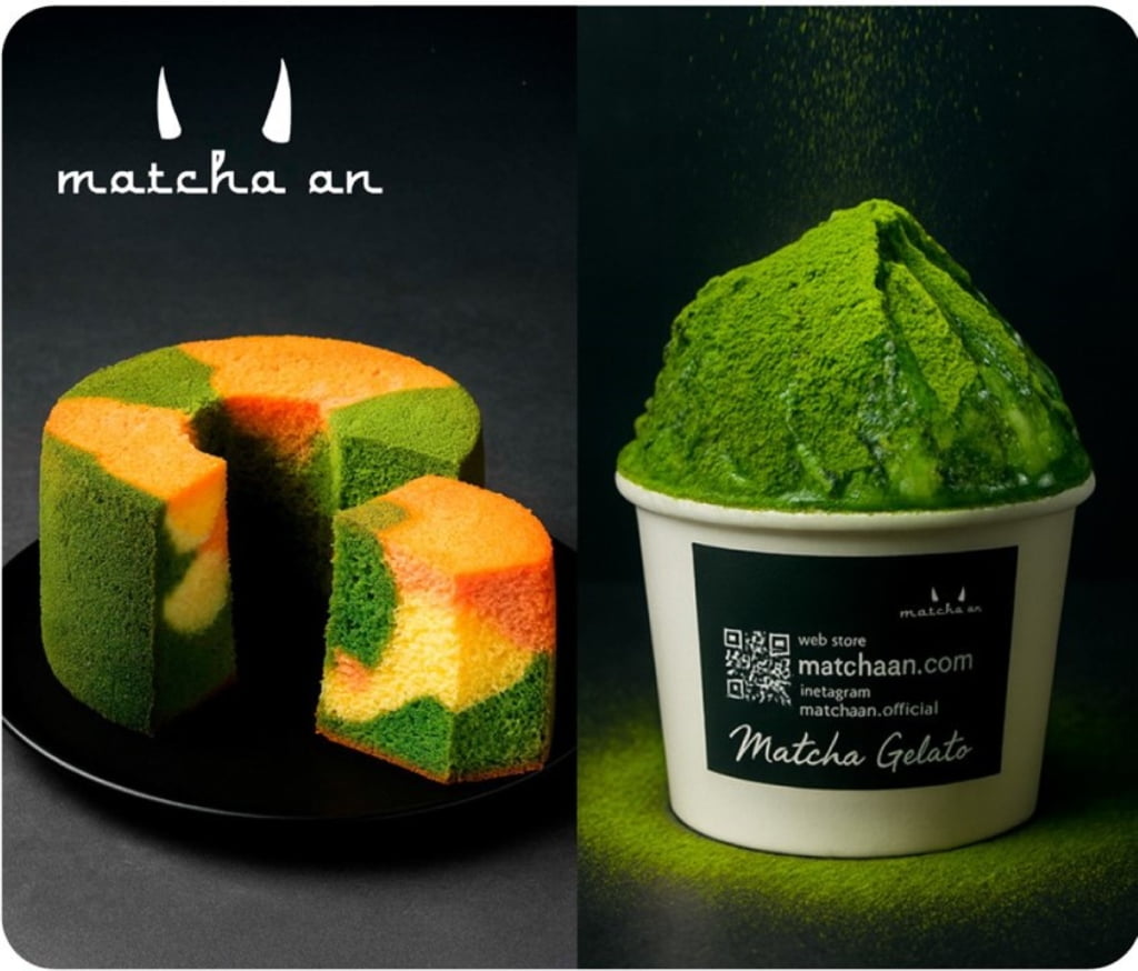 左から、福井・坂井「matcha an」の「抹茶の濃淡が織りなす茶奏マーブルシフォン」(1ホール/2,650円、季節限定品)、「Matcha Gelato Duo」(1個/800円、阪神梅田本店限定)※12月17日(水)~12月19日(金)出店 -