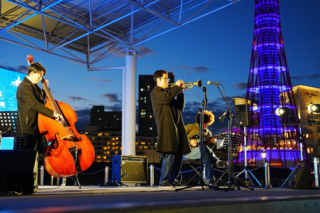 ステージエリアやクリスマスツリー前、芝生エリアといったメリケンパーク内のあちこちでは、大道芸やライブパフォーマンスが開催されます。2025年12月24日(水)・25日(木)は、毎月音楽ライブを実施する「メリケンミュージックナイツ」とのコラボレーションステージも予定しています。