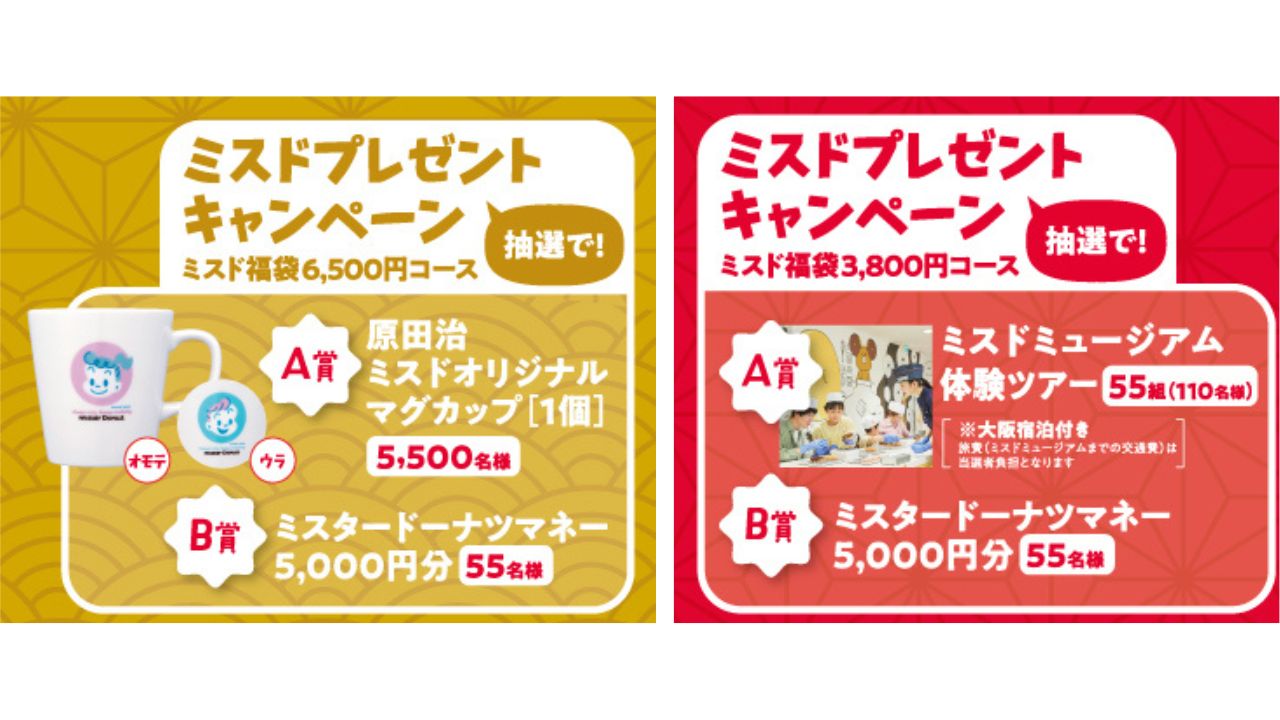 「ミスド福袋2026」にはまだ続きがあります! それぞれの福袋に入っている「ドーナツ引換カード」を応募券として使うと、抽選で「ミスドミュージアム体験ツアー」や「原田治オリジナルマグカップ」が当たるキャンペーンに参加可能。
