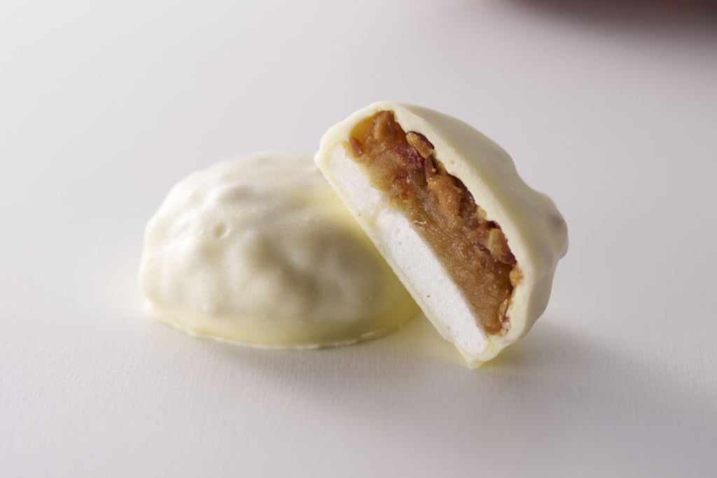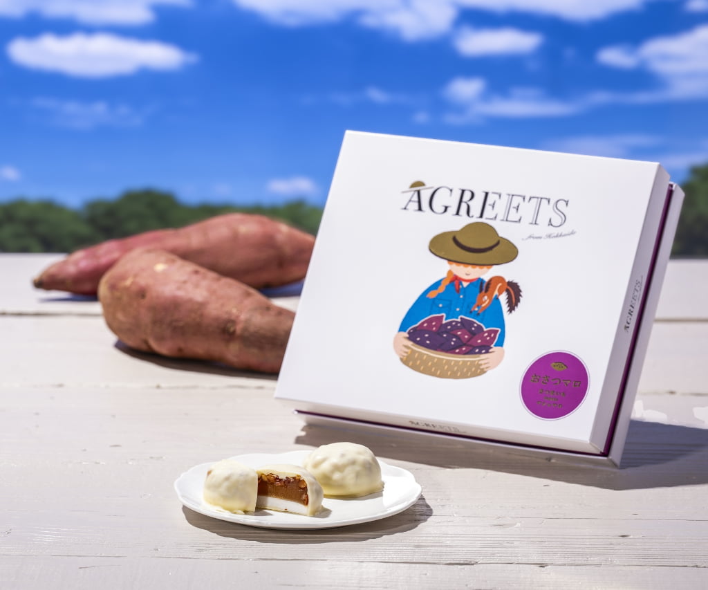 なかでも「ISHIYA」の新ブランド「AGREETS」(アグリーツ)は要注目! 北海道のサツマイモ「由栗いも」を使用した「おさつマロ」は、濃厚なサツマイモの餡とふわっと軽いマシュマロを、「白い恋人」で有名な「ISHIYA」のホワイトチョコレートでコーティング。カリッと香ばしいキャンディーコーティングのアーモンドをトッピングし、食感も楽しいひと品です。