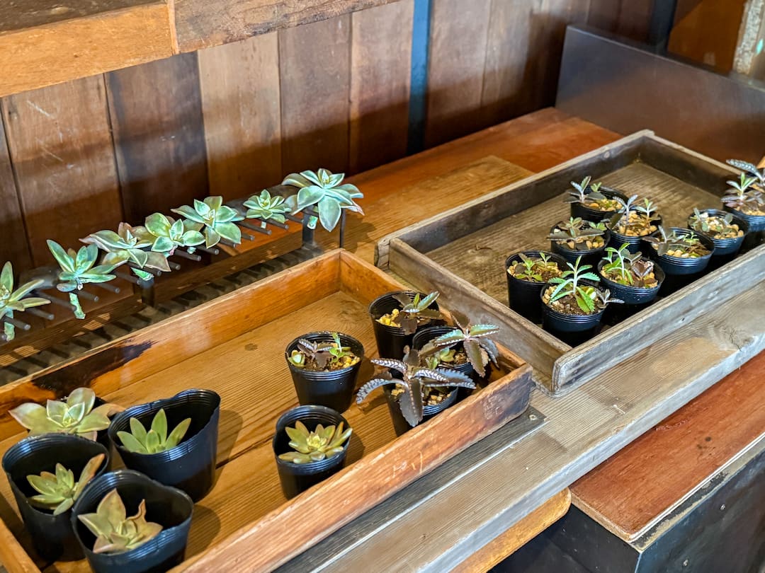 「森森舎」のレジ前には、小さな多肉植物がずらり。なんとこちらは、気に入ったものを無料で持ち帰ることができるという、店主さんの粋な計らい。
