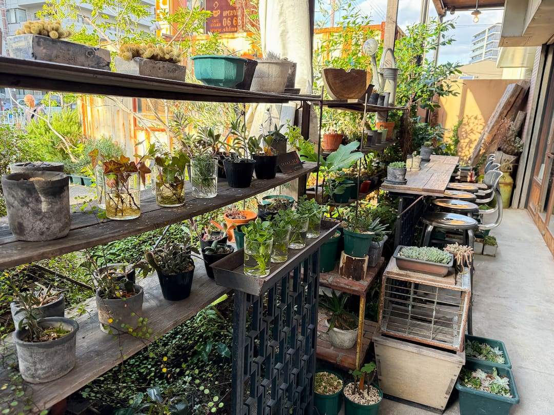 ガーデニングとものづくりが好きな店主が営む「森森舎」は、大阪メトロ御堂筋線「西田辺駅」から徒歩10分、阪堺電気軌道阪堺線「姫松駅」からは徒歩7分。あべの筋沿いで存在感を放つ、たくさんの緑に囲まれた建物がひときわ目を引きます。