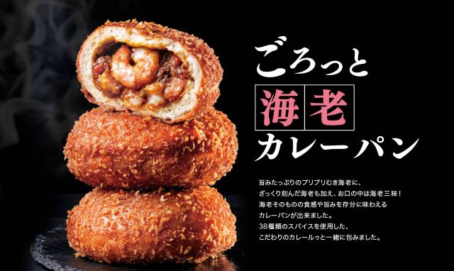 うまみたっぷりのプリプリむきエビに、ざっくり刻んだエビを加えたエビづくし。エビ本来の食感やうまみを存分に味わえるカレーパンです。