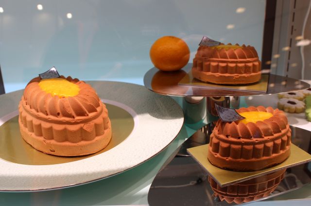 写真はシェフのおすすめ「ムース・ショコラ ミカン」。ペルー産ミルクチョコのムースとマダガスカル産ダークチョコのムースに、しっとりとしたビスキュイ生地を合わせ、南濃みかんの自家製コンフィチュールで仕上げたムース・ショコラです。エアリーなムースは濃厚だけど軽やか。なめらかなくちどけと、やさしいみかんの香りが広がります。
