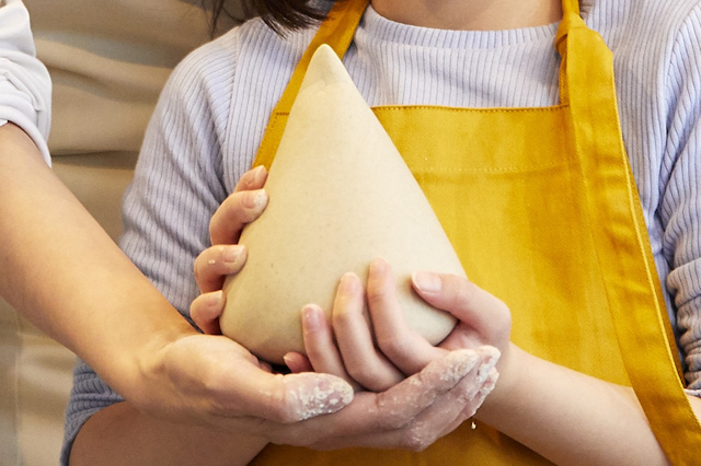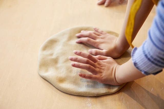 生地を片手で握って耳たぶのような触感になれば、こねてまとめていきます。生地をこねるのは少し力がいるので、先生とママに交代。腕の力ではなく、体重をかけて手のひら全体で練りこむのがポイントです。