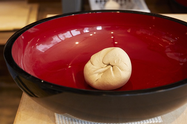 生地の中の空気を抜くように練りながら、鉢のふちで生地を転がして円錐形に近づけます。