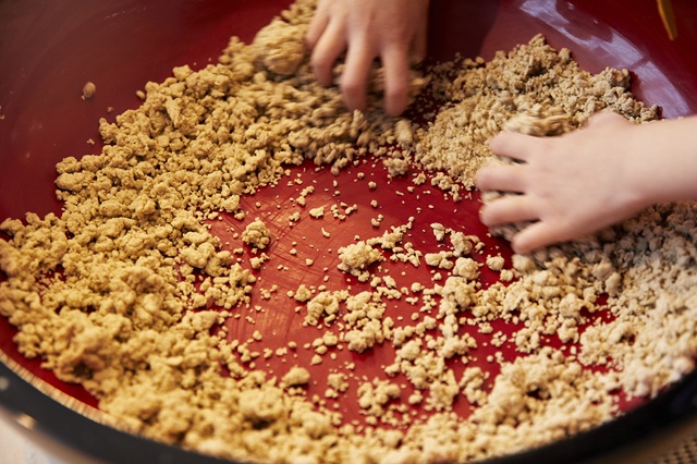 粉が入った鉢に200cc~250ccの水を3回に分けて加え、両手の指先を使って粉と水を混ぜ合わせます。