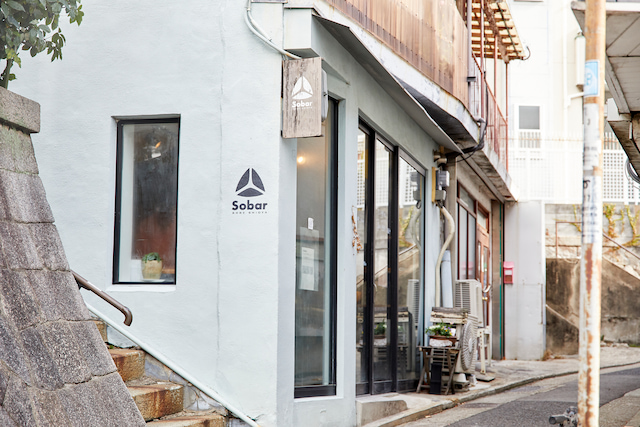 JR・山陽「塩屋」から徒歩1分のゆるやかな坂を上った先にある、そば教室「Sobar」。洋品店をリノベーションした工房は、ガラス張りのモダンな外観が特徴的です。