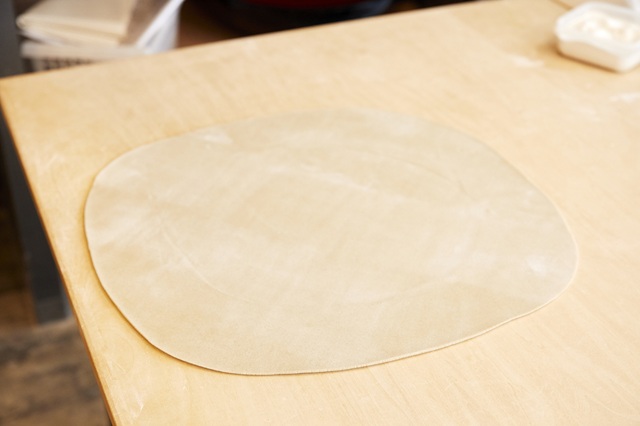 丸い生地を四角形にするため、麺棒で縦横に生地を伸ばしていきます。麺棒に力を入れすぎないよう、そーっとそーっと……。