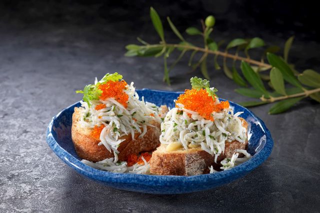 噛むほどにうまみが広がるカンパーニュに、こぼれんばかりの釜揚げしらすと、プチプチ食感が楽しいとびっこをトッピング。お酒が進むひと皿です。