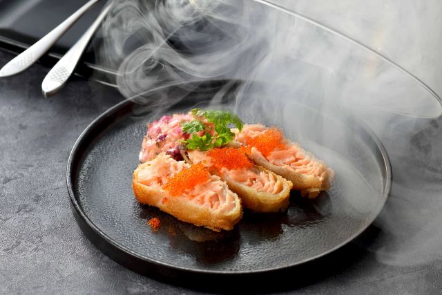 ほどよい脂とまろやかな味わいが特徴のグランサーモンをレアに仕上げたひと皿。提供時のスモーク演出にも注目です。