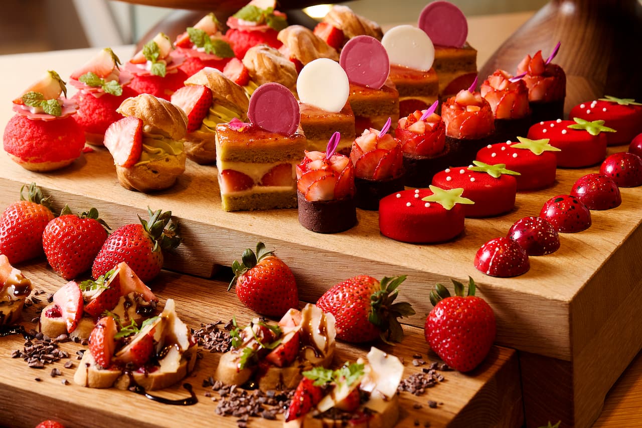 チョコレートタルトに苺ムースと苺コンポートを重ねた贅沢なタルトや、クリーミーな苺パンナコッタにNYチーズケーキ、国産フレッシュ苺を乗せた濃厚なガトーショコラ、さらに大阪・関西万博で注目を集めたオーストラリアの伝統菓子「ラミントン」もラインナップ。ウェルカムドリンク、スイーツ11種、セイヴォリー3種、スコーン2種、コーヒー・紅茶のフリーフロー で、心ゆくまで楽しめます。