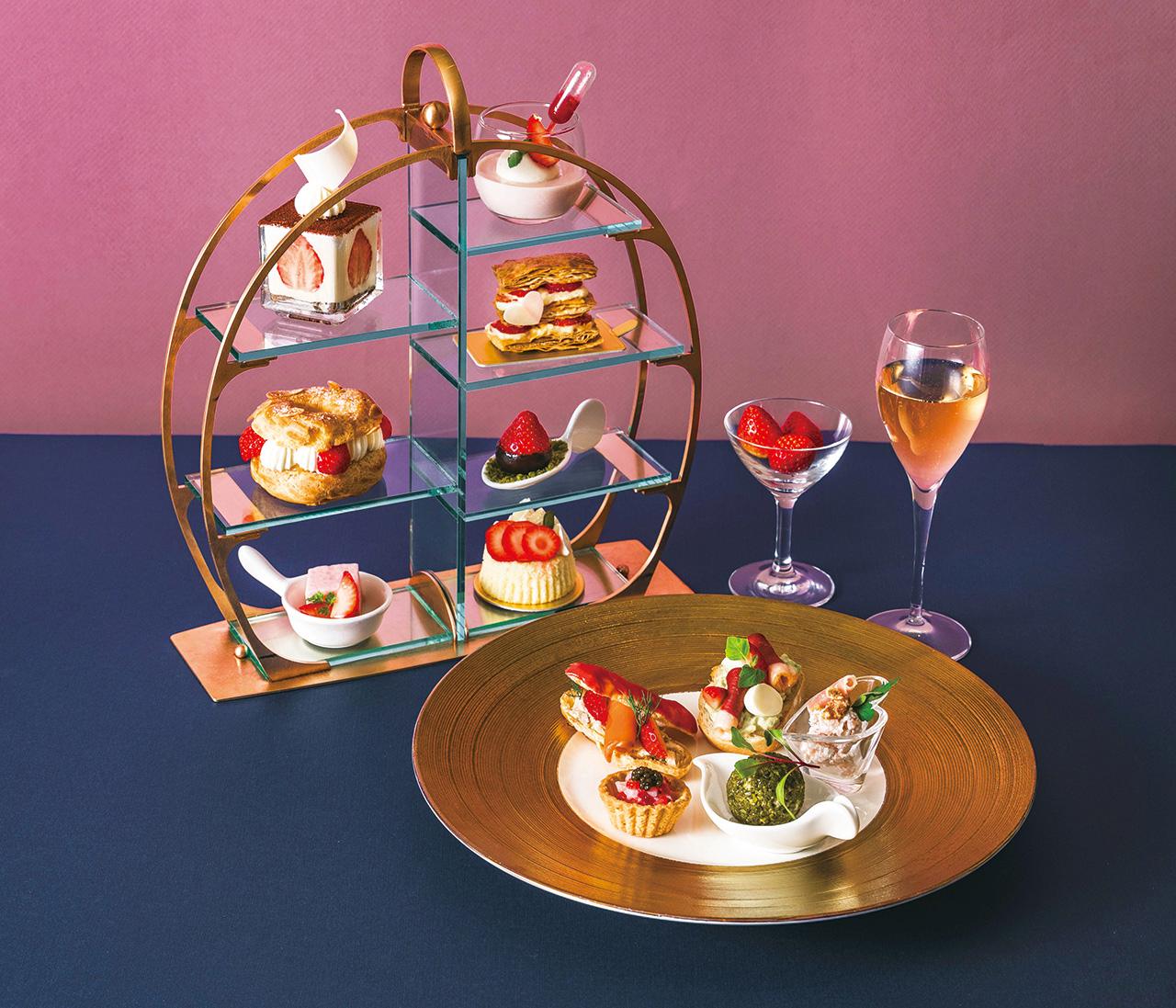 全てのスイーツ・セイボリーに苺を使用した“苺尽くし”のアフタヌーンティー。スイーツは、ミルフィーユやティラミス、パリ・ブレスト、フレッシュ苺など全8品をラインアップ。セイボリーには、苺入りのフォアグラムースを、砕いたピスタチオで包んだフォアグラ・ボンボンや、苺とスモークサーモンのが相性抜群のエクレアなど全5品を用意。ドリンクは、シャンパンまたはノンアルコールカクテル「ストロベリートニック」から1杯を選べます。