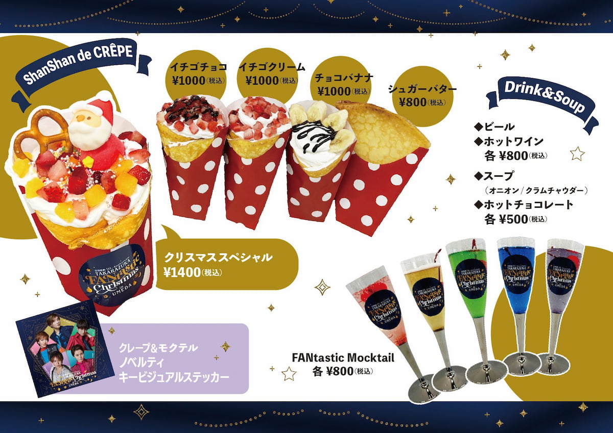 MBS本社前には「TAKARAZUKA FANtastic Christmasキッチンカー」が登場します。宝塚歌劇公式Instagramの投票で名称が決まった「ShanShan de CRÊPE(シャンシャン ド クレープ)」をはじめ、クリスマスにぴったりのフード&ドリンクを存分に楽しめるそう。