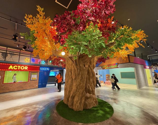 イオンモール大日3階にある「カンドゥー大日」のエントランスを入ると、「はるなつあきふゆの木」がお出迎え。館内には約30の仕事体験やワークショップが用意され、スマホや館内の予約機を使い、予約をとりながら参加していきます。