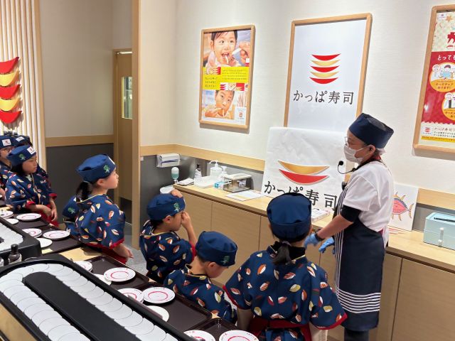 かっぱ寿司が手がける「すし職人」では、子どもたちがはっぴを着用して、まぐろ・いくら・サーモンのにぎりを実際につくり、保護者に提供するまでを体験。参加した子どもたちのまなざしは、真剣そのものでした。