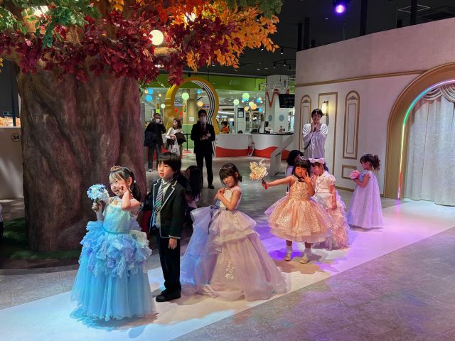 女の子に人気の「モデル」体験では、好みのドレスに着替えてランウェイに登場。