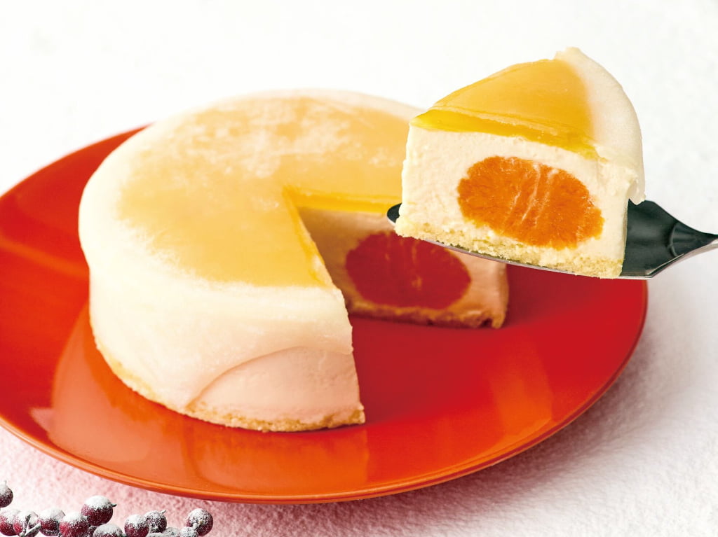 北海道産クリームチーズを使ったチーズムースの中にみかんを丸ごと5つ入れた「雪あかり」。天面には「せとか」を使用したソースを乗せて爽やかな甘みをプラス。もちもちとした求肥で優しく包み込み、お正月にぴったりな華やかなケーキとなっています。