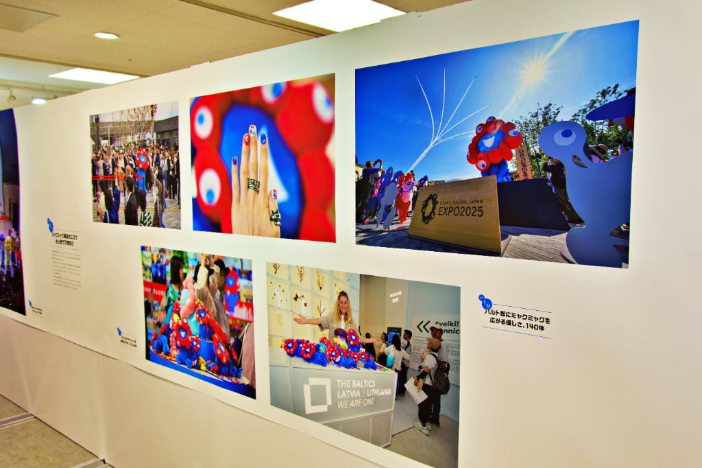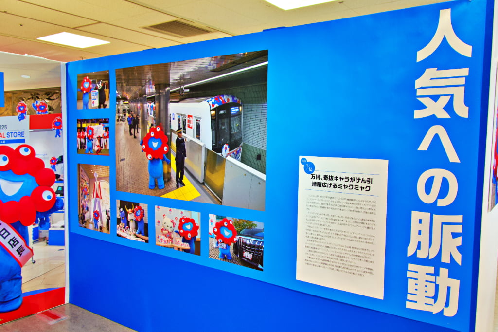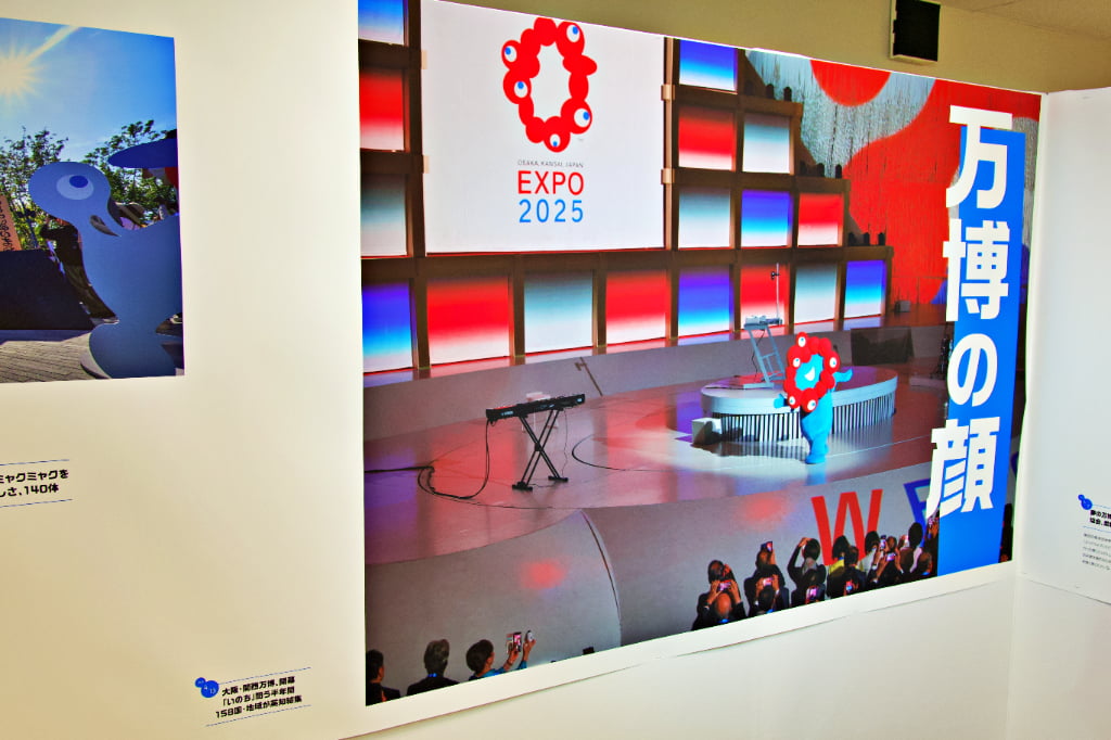 写真展の次のエリアでは、いよいよ大阪・関西万博が開幕! 会場を縦横無尽に駆け回り、来場者と触れ合いながら万博を盛り上げたミャクミャク。国内外のパビリオンや著名人、人気キャラクターとのコラボレーションも次々と発表され、話題となりました。
