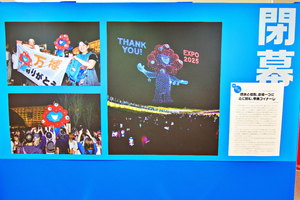 東ゲート、西ゲート入ってすぐのところに設置されたミャクミャクの像は、常に撮影の列ができる人気スポットでした。閉幕日には、その人気を象徴するかのように多くの来場者が別れを惜しむようにカメラを向ける姿があふれ、まさに"スーパースター"としての輝きを見せてくれたミャクミャク。会場では、大阪・関西万博184日間の集大成を伝える写真が展示されています。