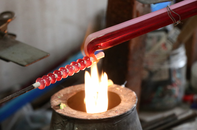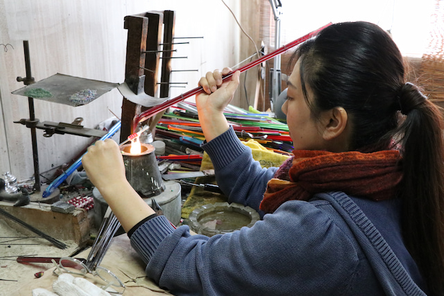 工房では、和泉蜻蛉玉の制作体験を実施。火気を使う本格的な体験は15歳以上から参加でき、伝統工芸士の指導のもと、ガラス棒を炎で溶かしながら形を作っていきます。