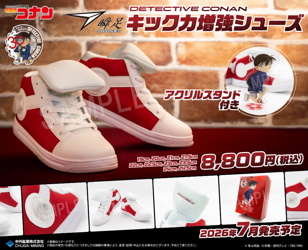 本商品は、2018年にアキレス株式会社が展開する子ども靴ブランド「瞬足」によってプロデュース・製造されたアイテム。『名探偵コナン』がTVアニメ放送30周年という節目の年を迎える2026年を前に再販が決定しました。