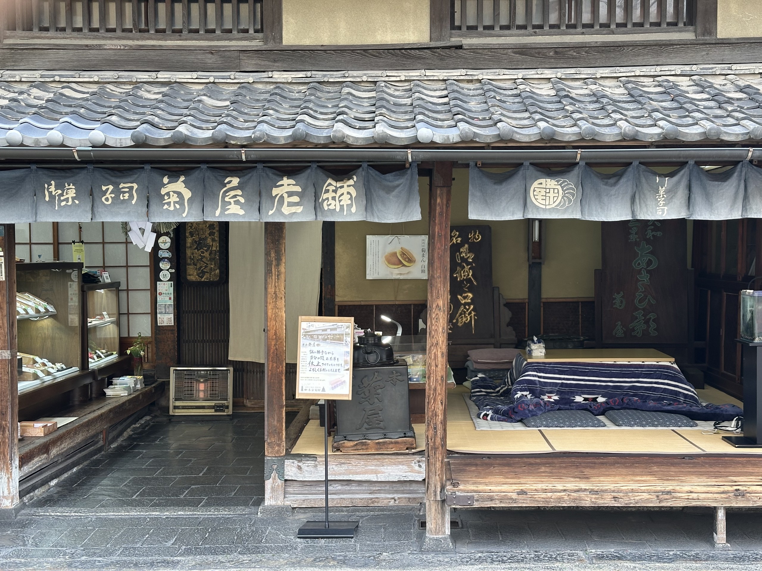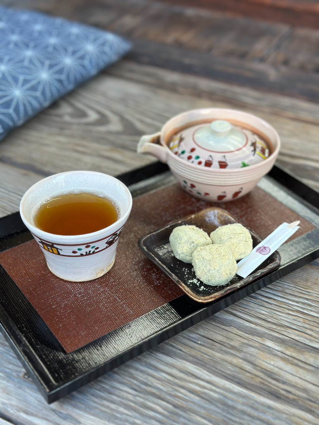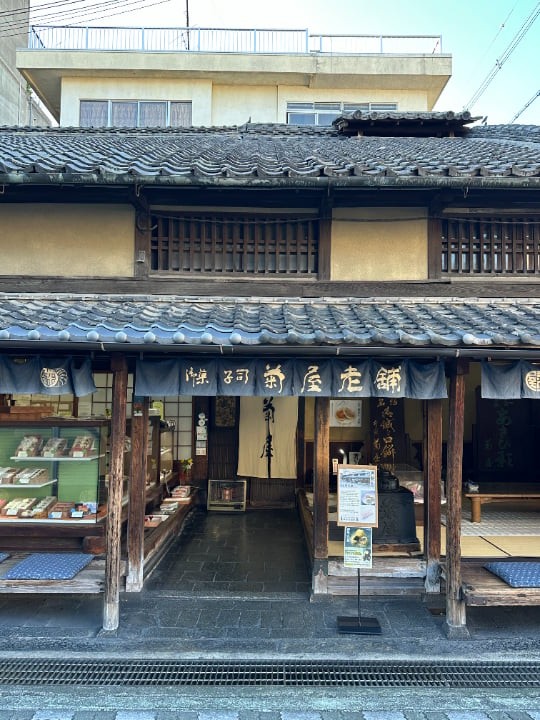 本店では、城下町を眺めながら軒先の縁側でお茶と一緒にお菓子を楽しめます。赤膚焼の茶器でいただくお茶とともに優雅なティータイムを過ごしてみて。