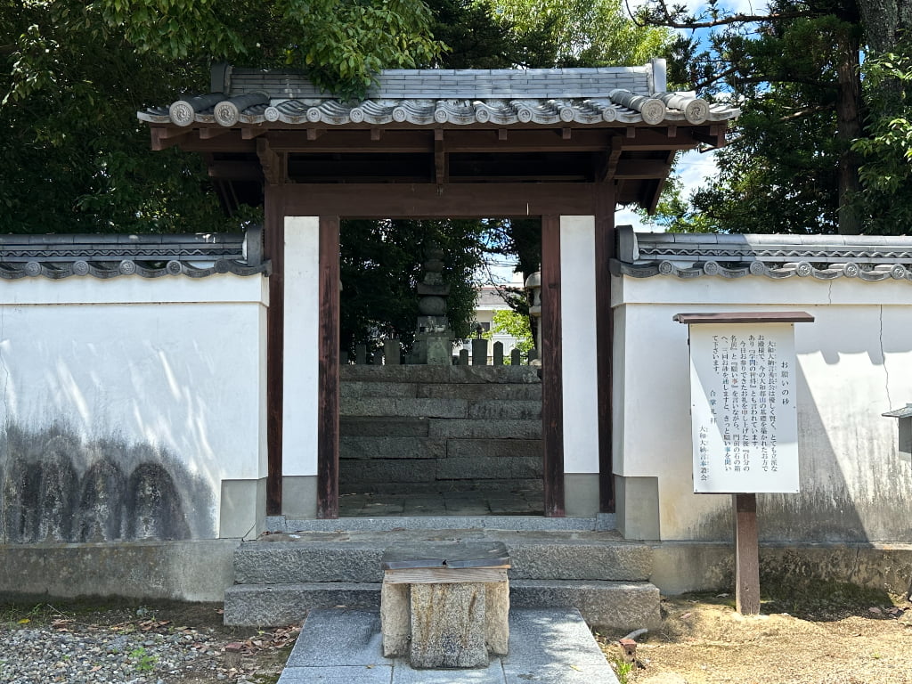 墓所前には「お願いの砂箱」があり、名前と願い事を唱え、箱の中の穴に砂を3回通すと願いが叶うといわれています。「学問の知将」と呼ばれた秀長にあやかって、お願いを。