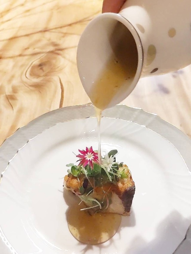 雪の下大根餅とイタリア産チーズのフリコ(おやき) 低温調理した鰤のソテー 柚子風味のコンソメ餡をかけて