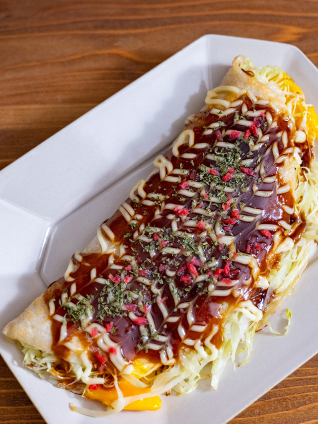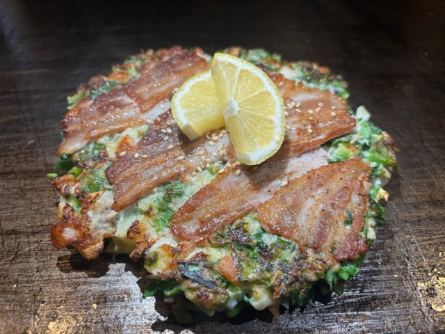 ビタミン・ミネラル豊富でスーパーフードとして注目される「ケール」を主役に、ジューシーな豚肉を合わせています。「ケール」の風味と豚のコクが鉄板の上で香ばしく焼き上がり、「お好み焼きは重い」というイメージを覆す、軽やかで満足感のある一品です。