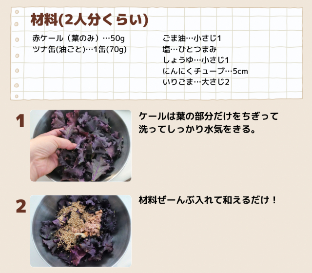 『ゆきあま』ケール(赤ケール)は、そのままちぎって食べても甘くておいしい! おかずとして食べるならシンプルな和え物にしようと思って、このレシピにしました◎