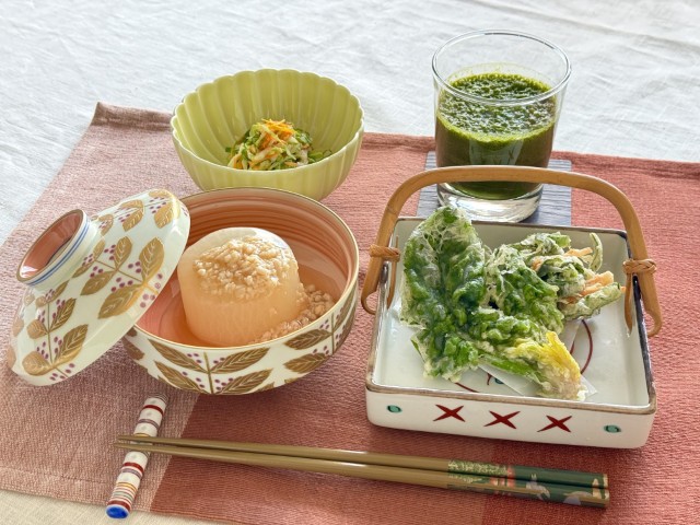 <メニュー>冬野菜と白身魚の天ぷら、大根のそぼろあんかけ、キャベツとにんじんの柚子味噌和え、ケールとにんじんのスムージー