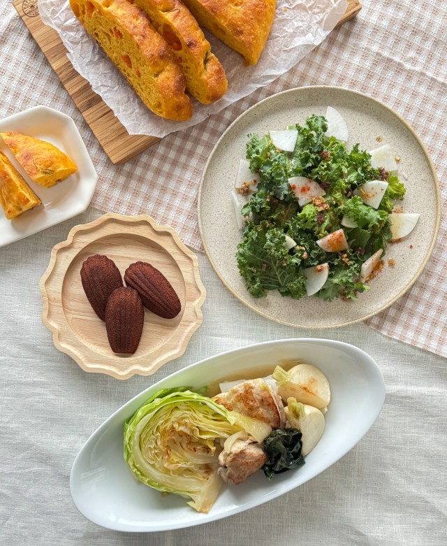 <メニュー>鶏もも肉と冬野菜の白いカチャトーラ、ケールと大根のローマ風サラダ、チョコレートのマドレーヌ、にんじんのフォカッチャ(試食)