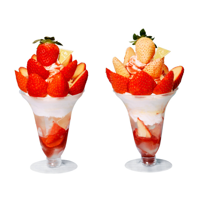 左から「新SUN」<阪神梅田本店限定>の「いちごさんのパフェ」(1人前/1,491円)、「3種のいちごパフェ」(1人前/1,791円)