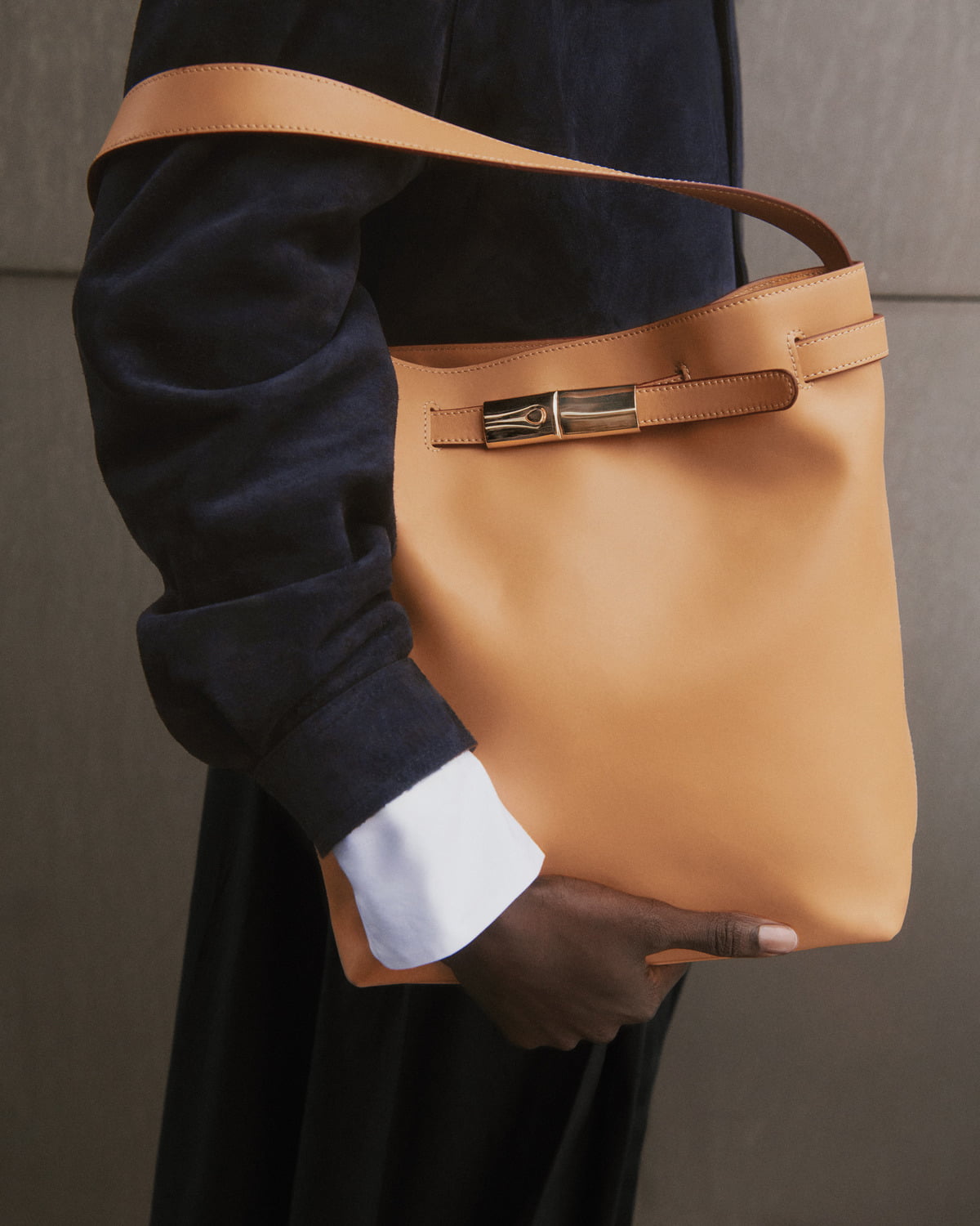 ミニマルなデザインを引き立てるのは、ロンシャンのシグネチャーライン「ル ロゾ」のバンブーとレザーベルト。レザーベルトは開けておけばリラクシー、きつく締めれば洗練された印象になり、気分に合わせて調整が可能です。コーデを格上げしてくれる、美しいカラーリングも魅力です。
