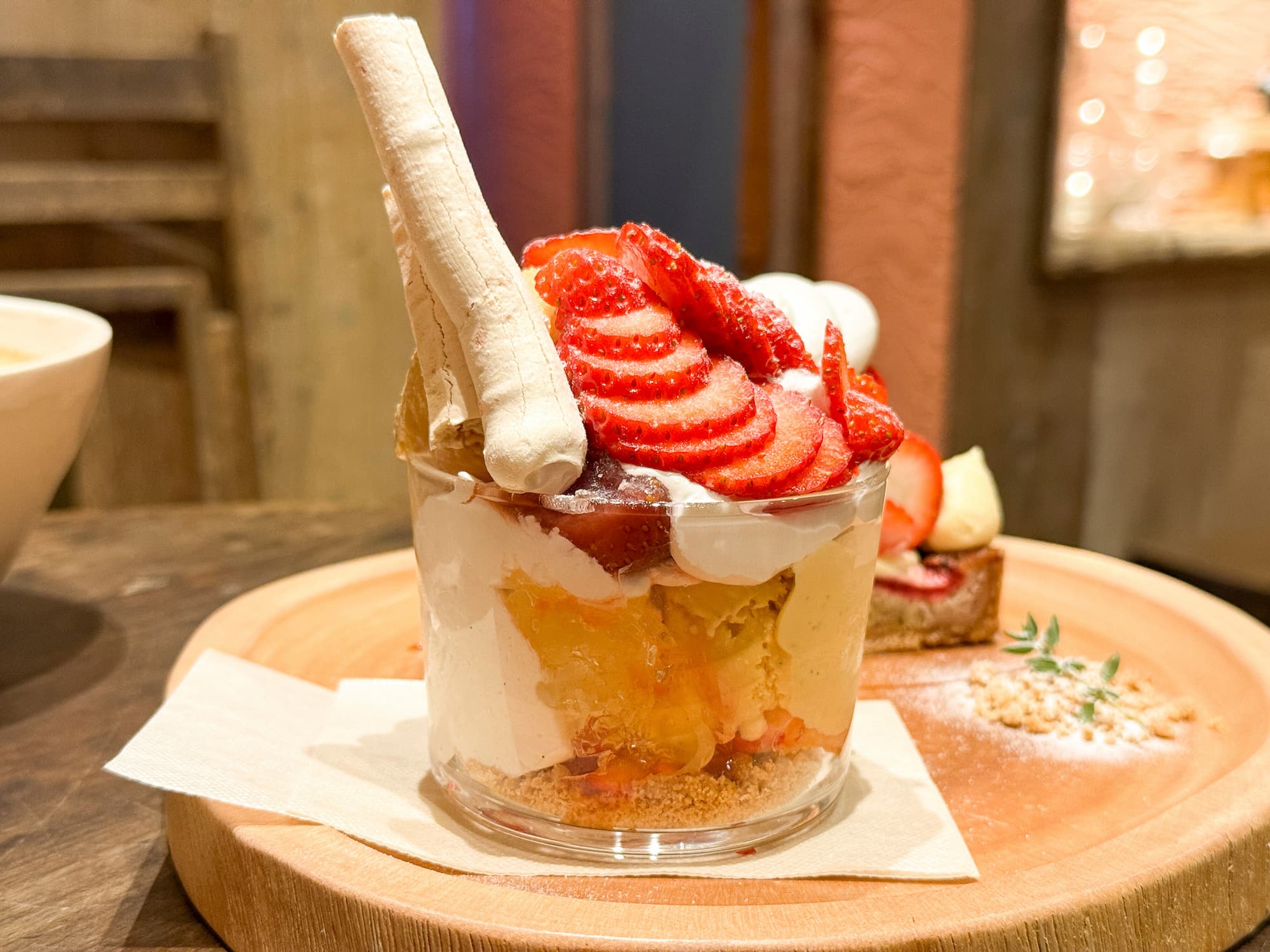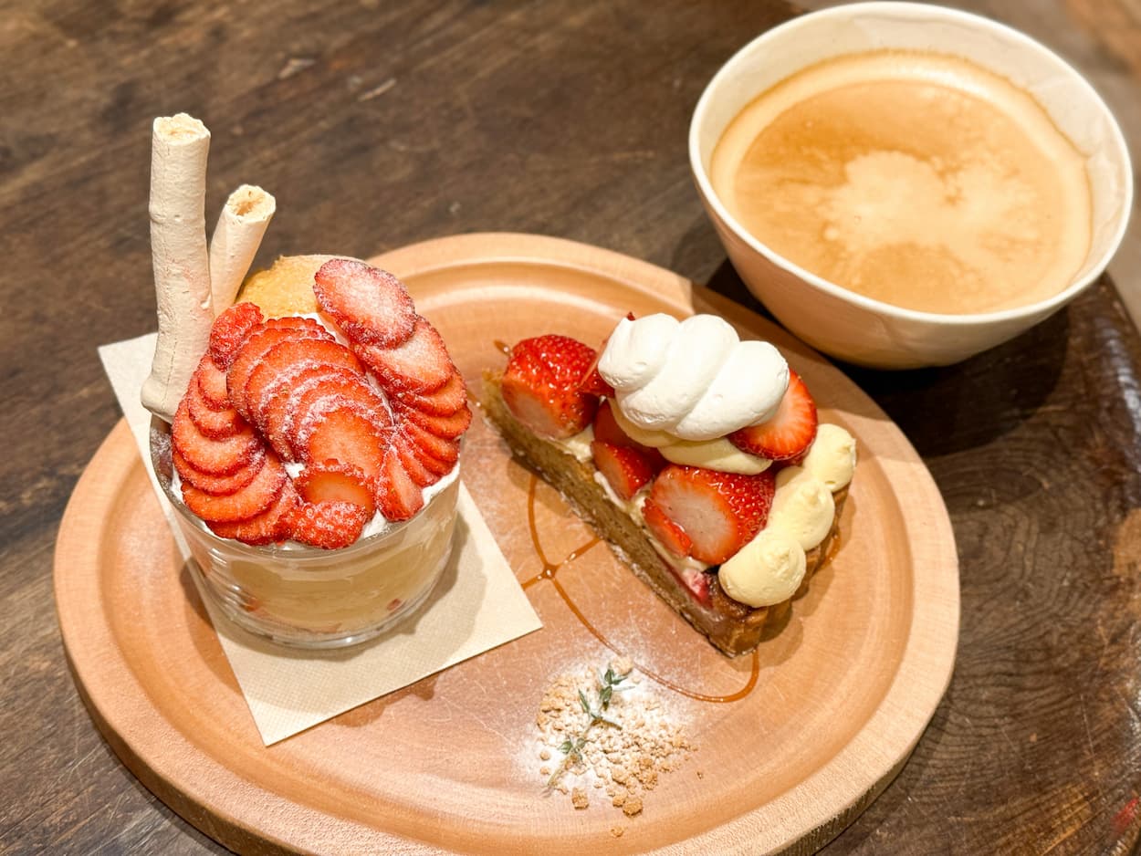 今回いただいたのは、イートイン限定の「いちごのパフェ」と、生地にまでこだわってつくられている「いちごのタルト」。ドリンクは「カフェオレ」を合わせました。