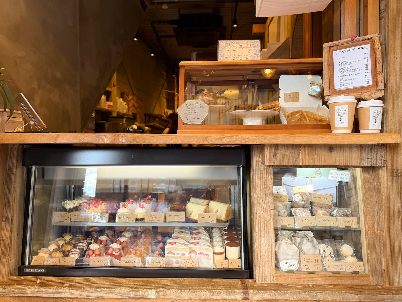 ショーケースにはケーキや焼菓子がずらりと並び、思わず目移りしてしまうほど。このほか、「いちごのパフェ」や「いちごのワッフル」といった、イートイン限定メニューもそろいます。