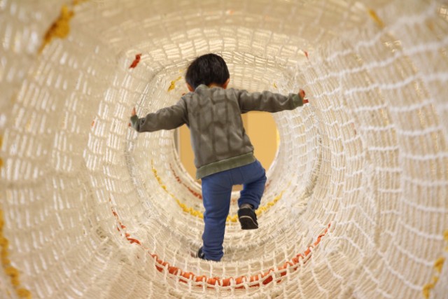 なかでもエントランスを入ってすぐにある多目的スペース「こべっこプラザ」は、こどもたちがまず夢中になる人気エリアです。巨大な階段やボルダリングのようなチャレンジウォールを登頂すると、そこは2階フロア。1階の天井部分にネットが張りめぐらされており、ネットのトンネルを進んで忍者のような冒険気分が味わえます。