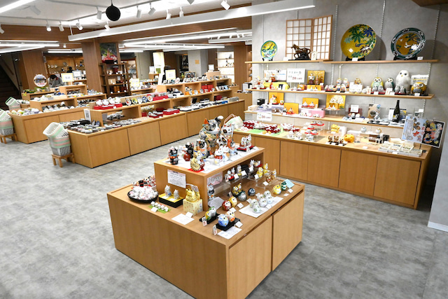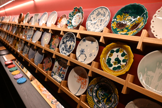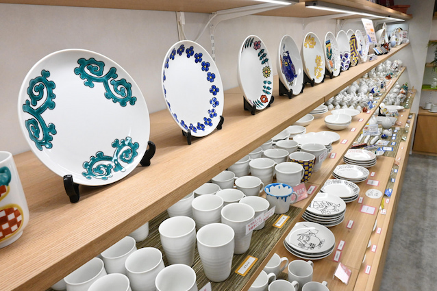 「界 加賀」から車で約5分の場所にある「九谷満月」。九谷焼のお皿やコップ、置物など約50種類以上のアイテムから好きなものを選んで、オリジナルの絵付け体験ができます。