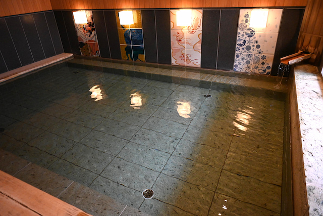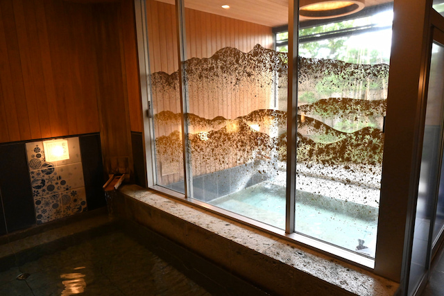 内風呂には地元の九谷焼作家が自由な発想でデザインしたアートパネル、仕切りガラスには金沢箔で描いた加賀地方の白山があしらわれていて、日光の入り方によって見え方が変わるので、朝と夜で異なる雰囲気を楽しむことができますよ。