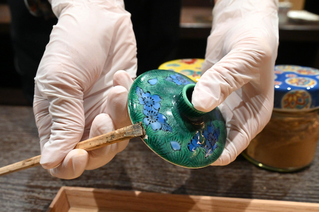 料理などに使用してきた九谷焼のひび割れや欠けを金継ぎで"寿命"を延ばし、大切な器をスタッフ自らの手で次へと繋いでいます。
